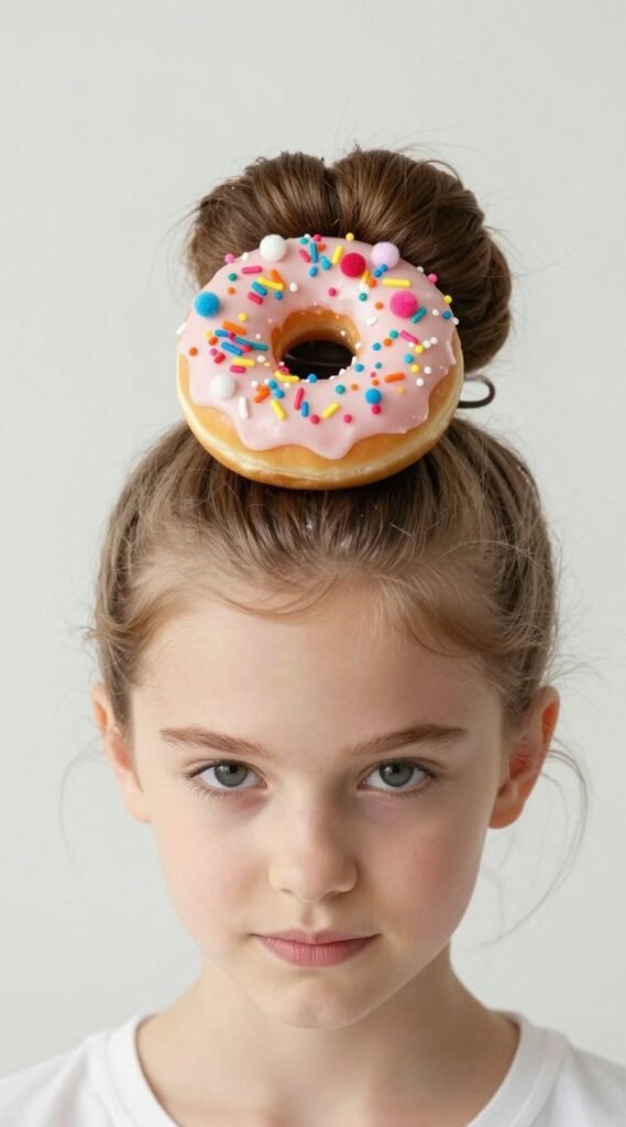 Next, grab some cardboard or felt cut into a donut shape, or even just a brown scrunchie. Attach it around the bun. For sprinkles, use colorful pipe cleaners cut into small pieces or tiny pom-poms glued on. Pro tip: A little bit of hairspray helps everything stay put, especially those tiny sprinkles. It’s adorably delicious and surprisingly simple to pull off.
