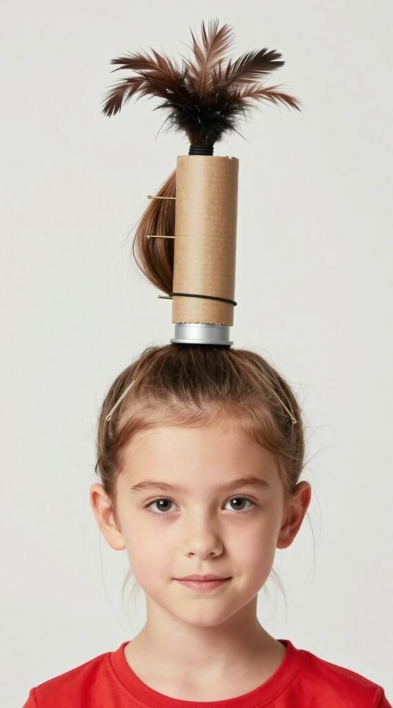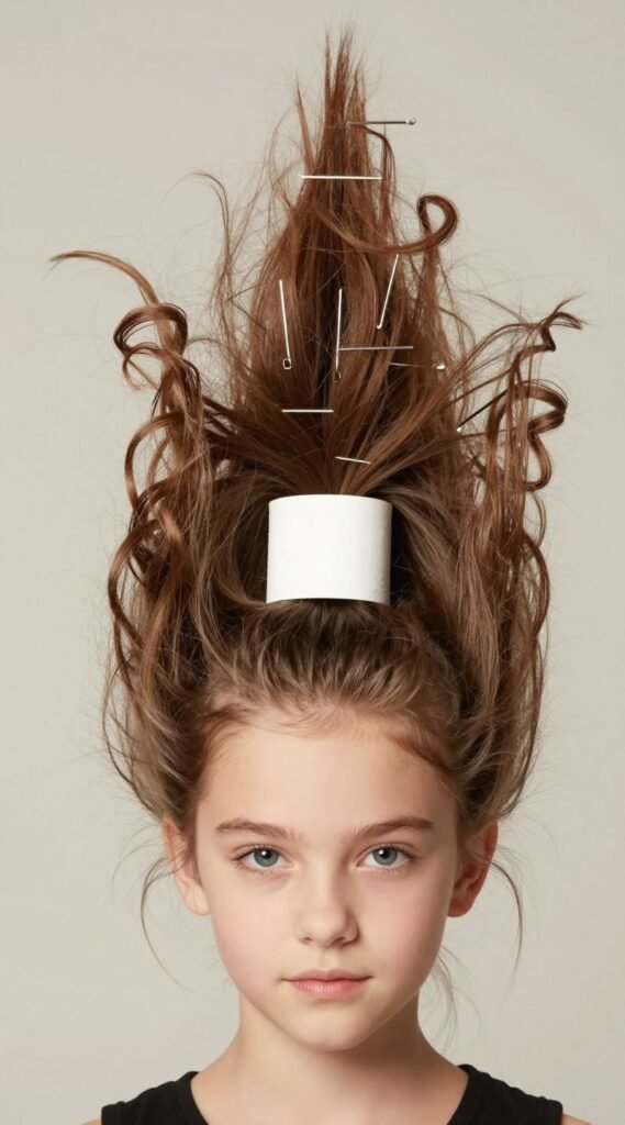 Insert a cardboard tube or a plastic bottle (cut to size) into the ponytail, then wrap the hair around it and secure with another elastic and bobby pins. The goal is a tall, whimsical tower. Add a fuzzy pom-pom or a feather to the very top. Pro tip: Lots of hairspray and a strong elastic are your best friends here. It’s wonderfully wacky and totally unforgettable.