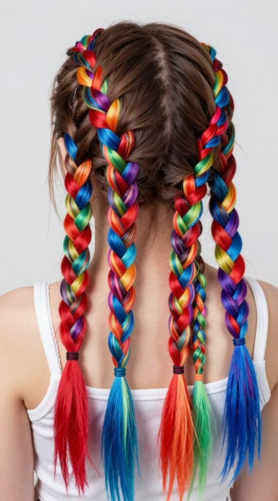 Braid each section, then weave different colored ribbons or yarn strands into each braid. Think red in one, blue in another, a whole rainbow. You can even use temporary colored hairspray for an extra pop. Pro tip: Secure the ends of the ribbons inside the elastic band for a seamless look. It’s a literal rainbow party on their head, and who doesn’t love a party?