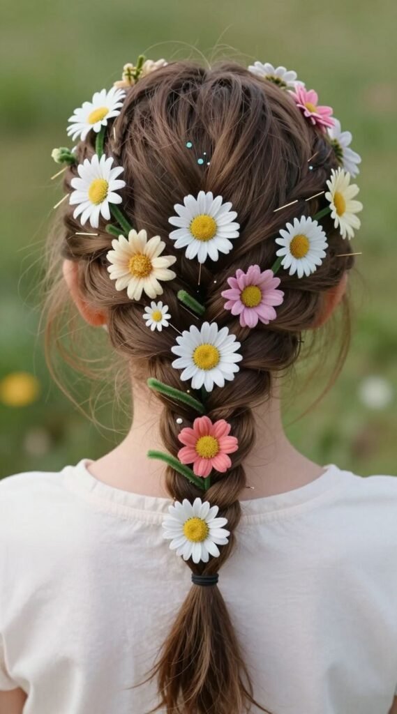 Now for the garden: attach a variety of fake flowers (the kind from a craft store, snipped off their stems) to bobby pins and strategically place them throughout the braids. You can even use a green pipe cleaner as a “vine.” Pro tip: Mix different sizes and colors of flowers for a vibrant, eclectic garden. It’s a spring awakening, no matter the season.