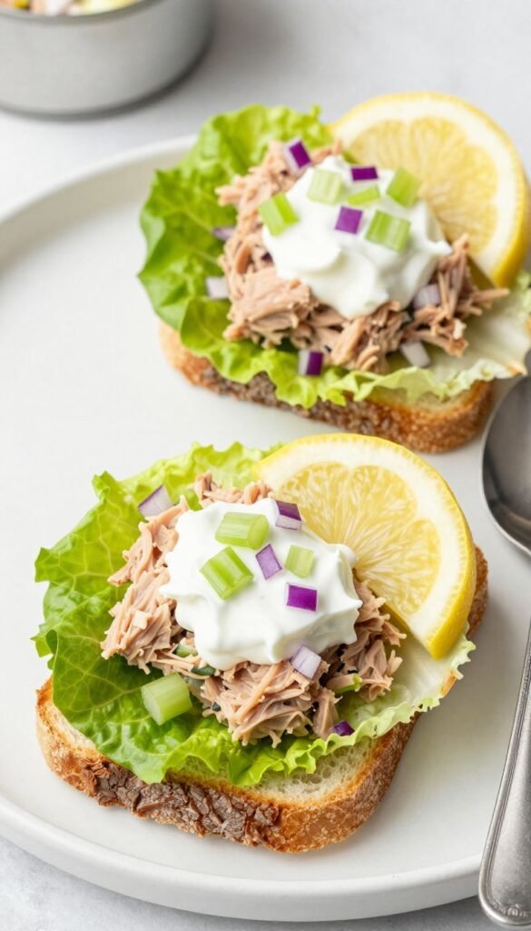 Say goodbye to bread, hello to crunch. Mix canned tuna (in water) with Greek yogurt instead of mayo, diced celery, red onion, and a squeeze of lemon. Spoon this deliciousness into crisp lettuce cups (butter lettuce or romaine work great).