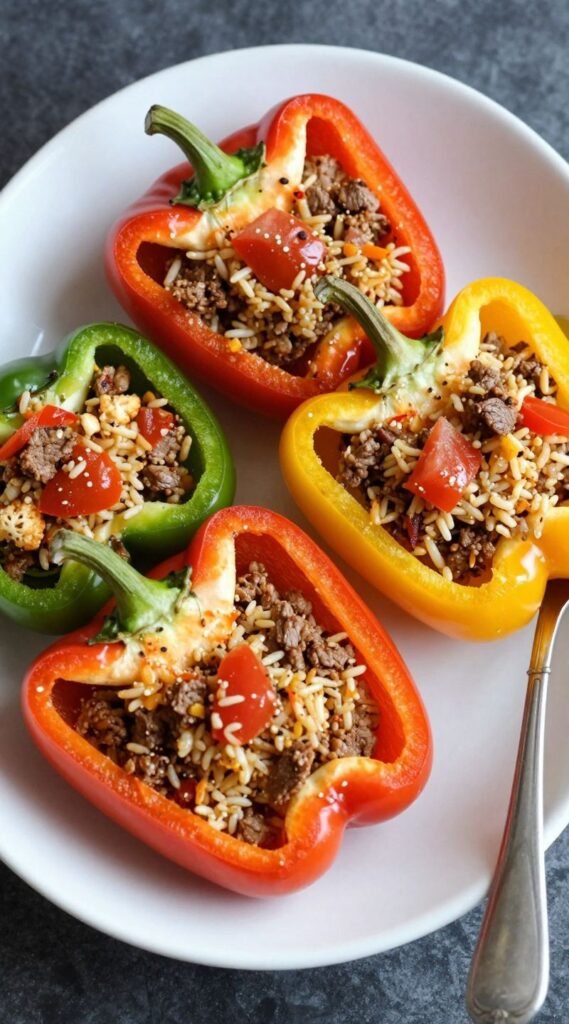 Bell peppers are filled with a savory mixture of ground beef or turkey, cauliflower rice, diced tomatoes, and spices, then slow-cooked until tender. Pro tip: Use different colored peppers for a visually stunning dish that’s also packed with nutrients. A complete meal that looks impressive but requires minimal effort.